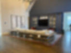 Custom made sectional for MDL interiors featuring Surrounded Built-in white oak custom stained shelving system unit with precision miter joinery in the corners. Nappa Leather premium hides full grain imported from Germany. Precision stitching detail. Seat cushions centre core organic latex wrapped in a generous amount of down fill. Back cushions feather / down fill mix 50 / 50